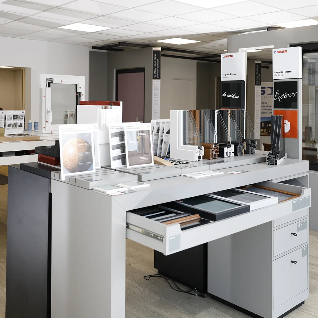 Grâce aux tables de démonstration, vous pouvez observer les profils en coupe, comparer les matériaux, les vitrages et les finitions afin de choisir les menuiseries les plus adaptées à votre logement.